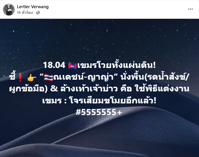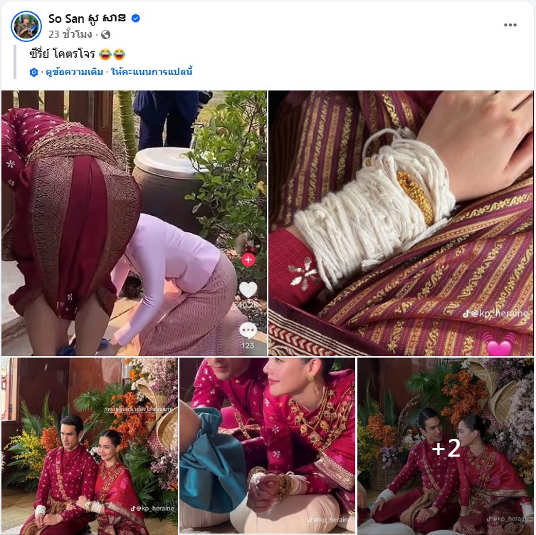 ล่าสุดผู้ใช้เฟซบุ๊ก Lertler Verwang ออกมาโพสต์ภาพและข้อความของชาวกัมพูชาว่า “เขมรโวยทั้งแผ่นดิน! ชี้ ณเดชน์-ญาญ่า นั่งพื้น (รดน้ำสังข์/ผูกข้อมือ) & ล้างเท้าเจ้าบ่าว คือ ใช้พิธีแต่งงานเขมร : โจรเสียมขโมยอีกแล้ว!”