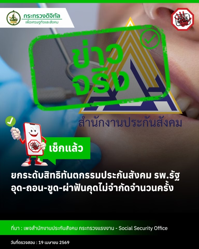เมื่อวันที่ 19 เม.ย.69 ที่ผ่านมา เฟซบุ๊ก Anti-Fake News Center Thailand ได้ออกมาเเจ้งข่าวเกี่ยวกับ การยกระดับสิทธิทันตกรรมประกันสังคม รพ.รัฐ อุด-ถอน-ขูด-ผ่าฟันคุดไม่จำกัดจำนวนครั้ง ซึ่งข่าวนี้ถูกเเพร่สะพัดออกไปก็ทำหลายคนสงสัยว่าเป็นข่าวจริงหรือไม่?